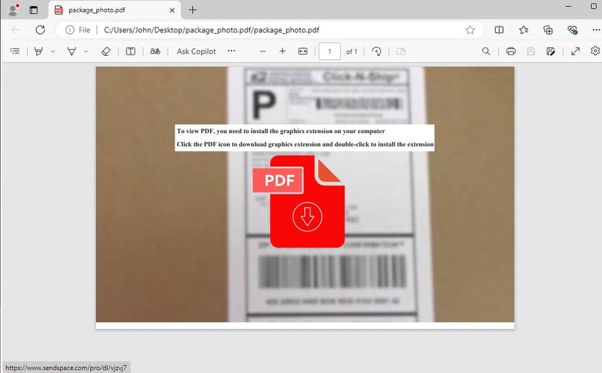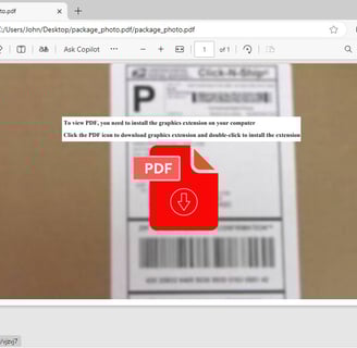 1) Delivery: A PDF is received as part of a phishing attempt. It contains a blurred image, and the user is instructed to click on an icon to download a "graphic extension" to view the image correctly.