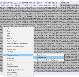 10) Let's analyze and decode the base64 payload obtained from dynamic analysis. We will use Notepad++'s built-in functions to decode this and remove any null values to reveal the underlying command.