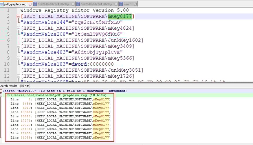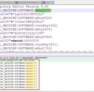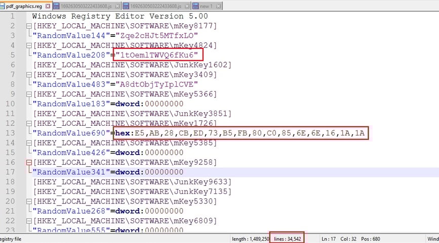 5) Let's now conduct a static analysis on the pdf_graphics.reg file we downloaded earlier. The file seems to be generated automatically, containing numerous registry keys and values with random names.