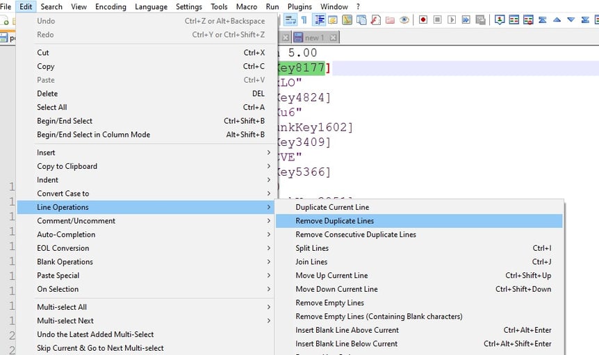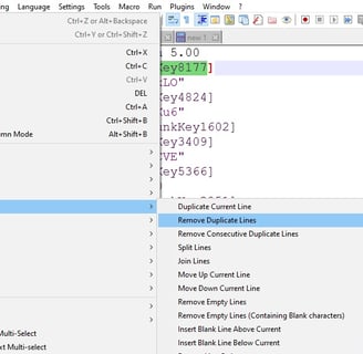 7) After analyzing redundancy patterns, I utilized a Notepad++ function to eliminate duplicate lines.