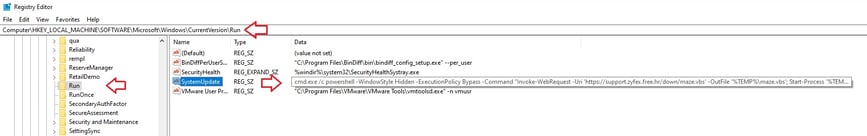 8) After removing duplicate values, it is evident that the code in lines 3221-3222 is malicious. This code downloads and executes a potentially harmful VBScript, which ensures persistence on the system. This poses a serious security risk and requires immediate action to mitigate the threat. The command is located in the HKEY_LOCAL_MACHINE\SOFTWARE\Microsoft\Windows\CurrentVersion\Run key, which causes it to automatically start whenever a user logs in. Additionally, the number of values decreased from 34,542 to 3,222.