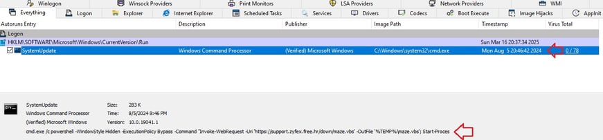 11) Malware Persistence: The screenshot below highlights the power of dynamic analysis using tools like Autoruns to investigate malware persistence. By comparing a saved Autoruns snapshot with the current system state, we can pinpoint changes made by potentially malicious software. Here, the "SystemUpdate" entry in the `HKLM\SOFTWARE\Microsoft\Windows\CurrentVersion\Run` key stands out. The VirusTotal detection ratio of 0/78 initially suggests it might be benign, but the command line reveals a PowerShell script designed to download and execute a VBS file from a suspicious URL.