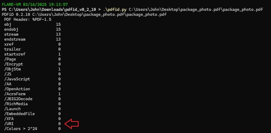 2) I started by conducting static analysis on the PDF using PdfID.py to identify any URIs embedded in it, but it failed. It appears that newer attacks have developed methods to bypass this detection.