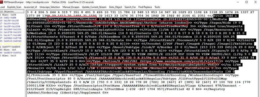 3) It's time to bring a bigger gun; this time, PDF Stream Dumper was used, and the metadata produced interesting results.