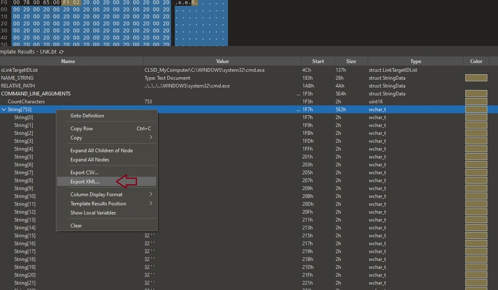 To extract this command, we need to collapse "Strings" under "COMMAND_LINE_ARGUMENTS" and export them to an XML file.
