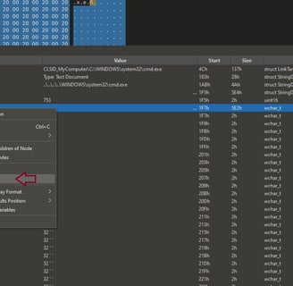 Look at the "sShellLinkHeader," which is a structured data header found in Windows Shortcut (LNK) files. It is the first part of a .lnk (shortcut) file and provides metadata about the shortcut, such as its target, creation time, and attributes.
